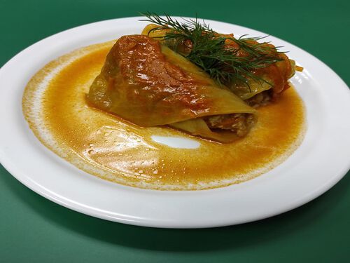 Капуста б/к, фарш мясной, морковь, лук репка, томат, масло растительное (180 гр.)