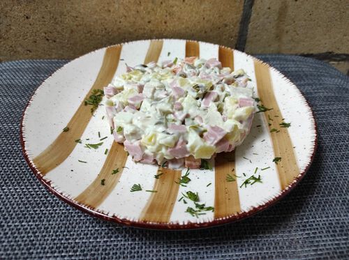 Картофель, морковь, колбаса докторская, огурец соленый, горошек зеленый консервированный, яйцо, зелень, майонез домашний (120 гр.)