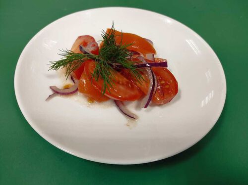 Помидоры, огурцы, красный лук, оливковое масло, соль