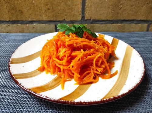 Морковь, специи, острая заправка, чеснок, куриное филе (100 гр.)