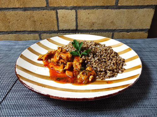 Гуляш из куриного филе с гречкой