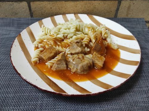 Свинина б/к, лук репка, чернослив, томат, масло растительное, макароны, соль (250 гр.)