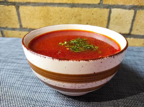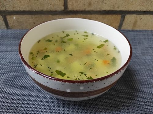 Куриный бульон, курица, капуста б/к, картофель, морковь, лук репка, масло растительное, соль, зелень, сметана (300 гр.)