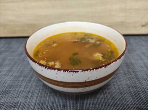 Бульон куриный, куриное филе, лапша, лук репка, морковь, зелень