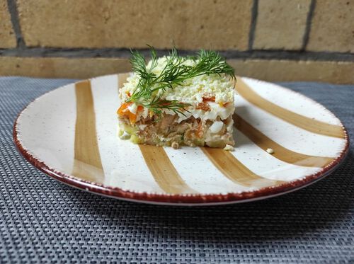 Картофель, морковь, горбуша консервированная, яйцо, сыр, майонез домашний (120 гр.)
