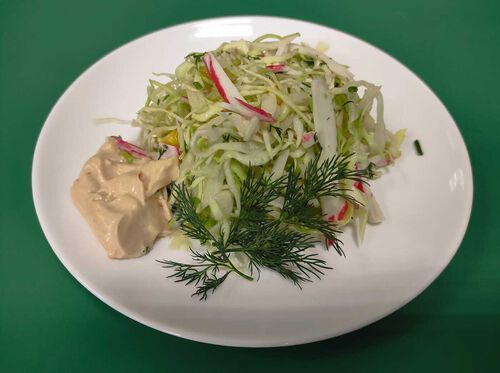 Капуста белокочанная, крабовое мясо, кукуруза, майонез, кетчуп, зелень (120 гр.)