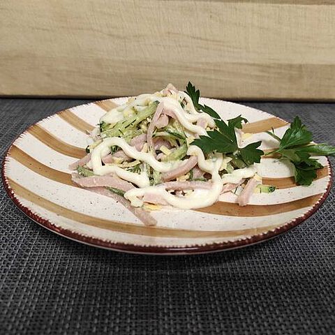 Китайский салат, куриное филе, огурцы, гренки, зелень, майонез домашний (120 гр.)